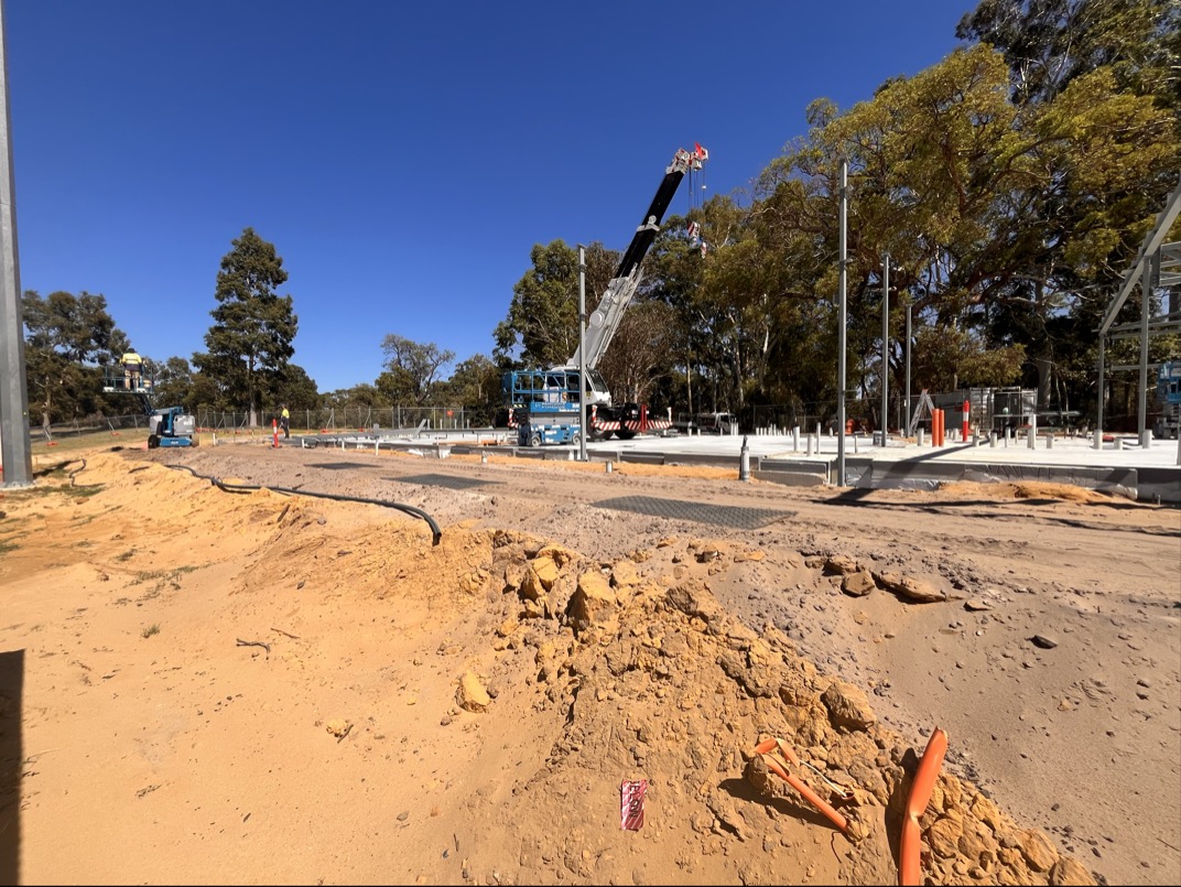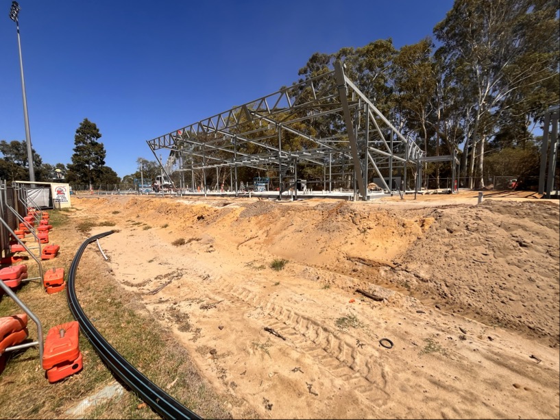 Earthworks are well underway. Playground and fencing have been removed. Reticulation has been rediverted and electrical conduits have started to be installed. Over the next month, electrical conduits, ground compaction and preparation for concrete slab and steel will be aimed to be completed.